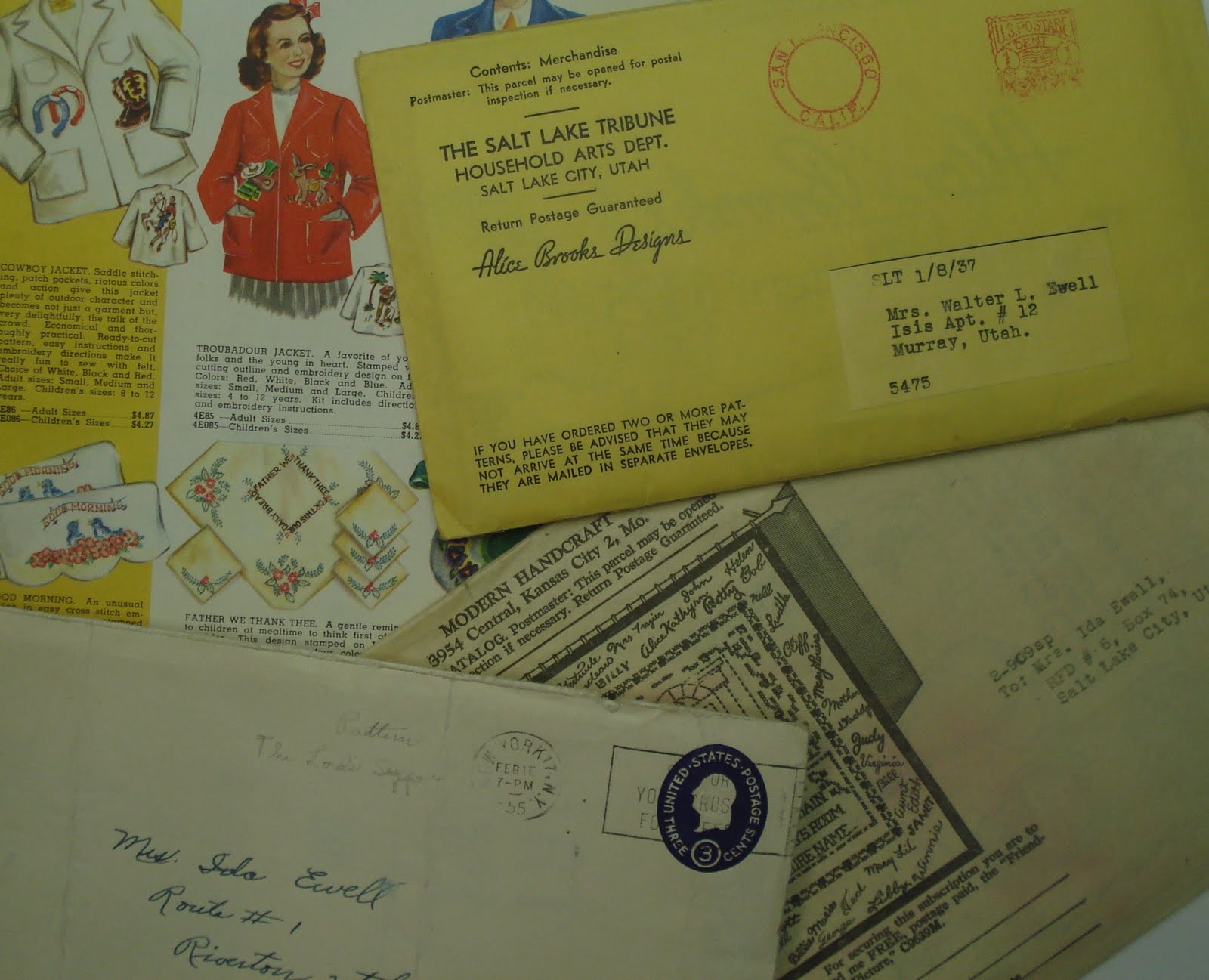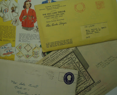 I have several I am showing you here from my Grandma, Ida Marie Ewell (my dad's mother)...above you can see some of the envelopes addressed to her as she would often order patterns from the newspaper or needlework companies.