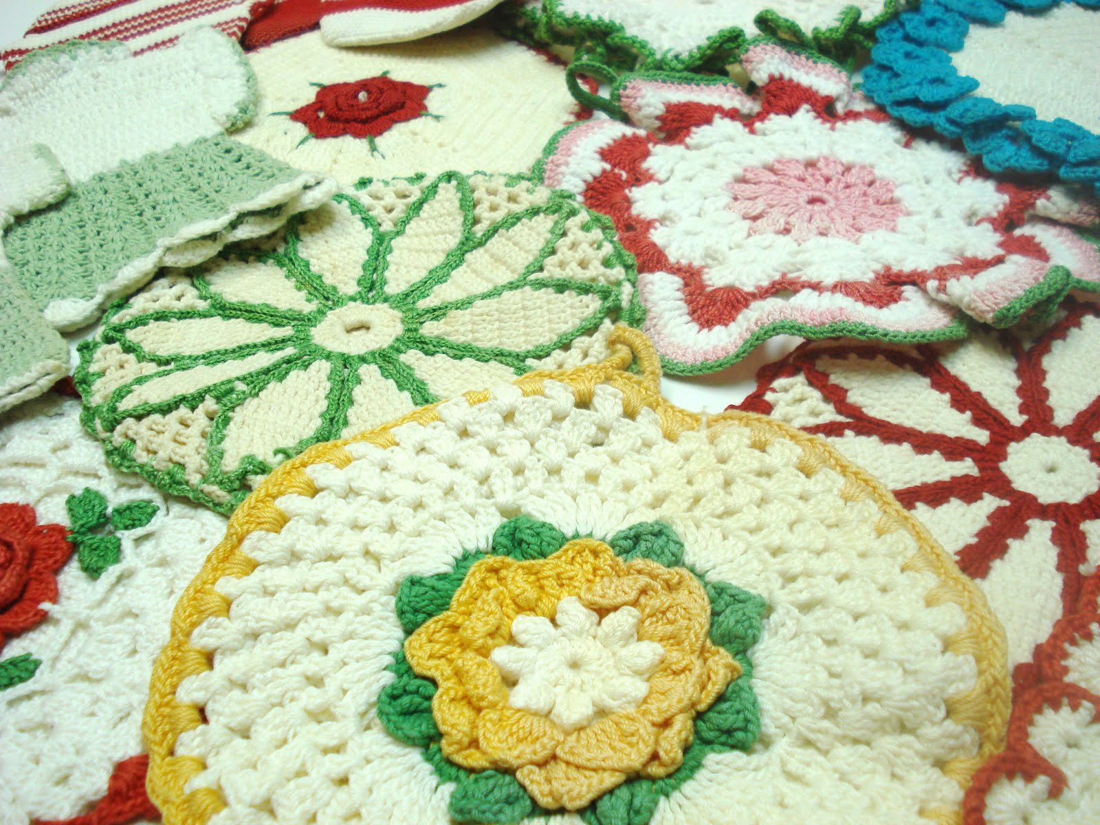 love the potholders. Love to pickup vintage linens. I have lots of napkins, aprons, dresser scarfs. They are just so beautiful.