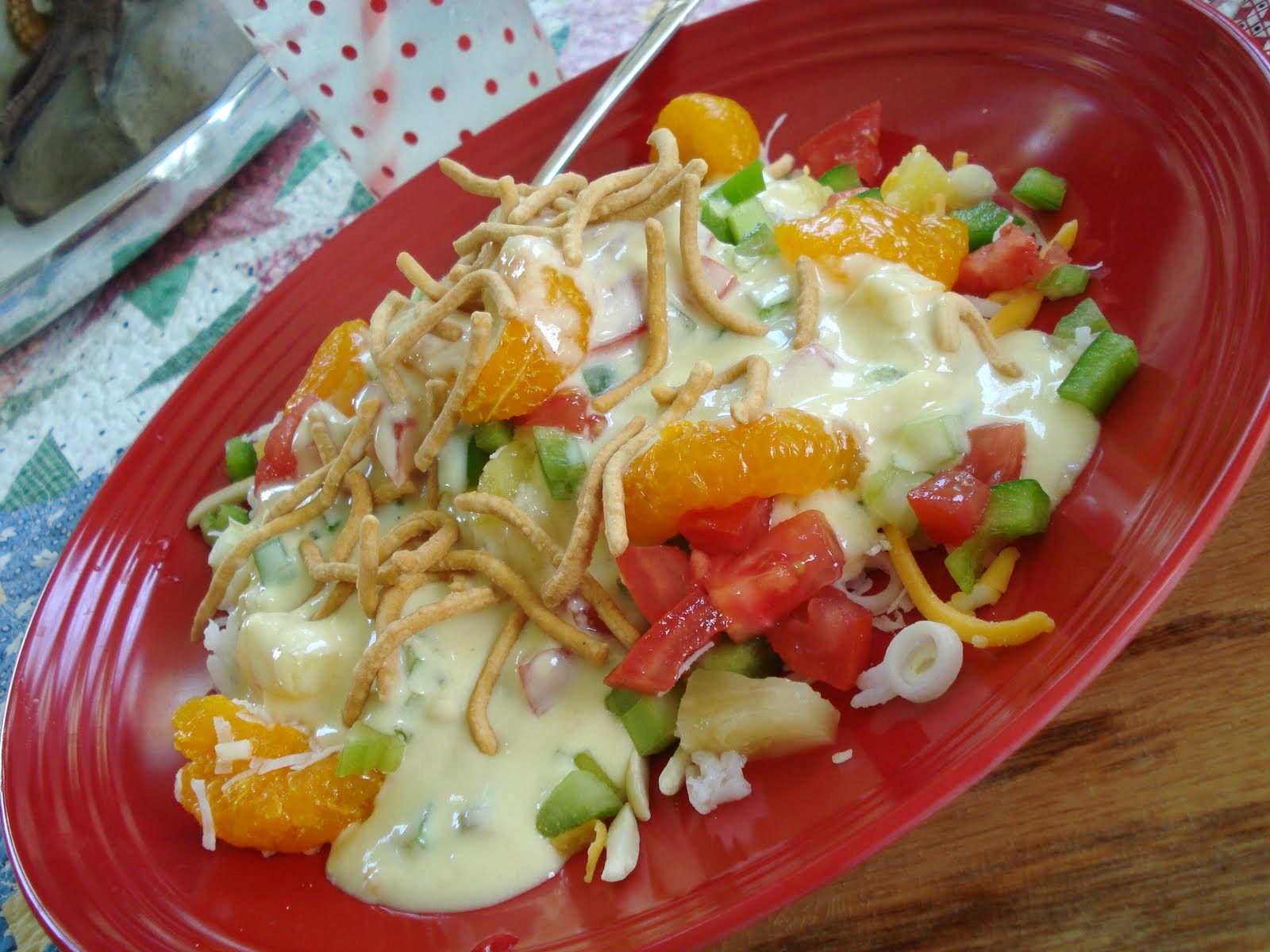 You layer everything on top of fresh steamed rice and then pour the sauce over all...topping with chow mein noodles.
