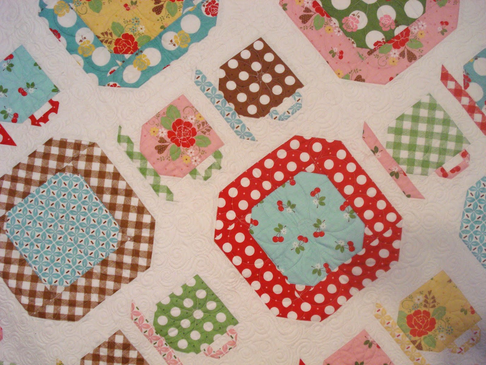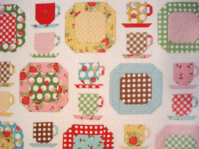 That's a very cute quilt. I love the look of the tea cups with your fabrics. Your fabric line looks great.