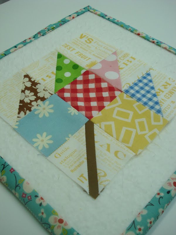 As you can see above, I also cut a solid brown square for the stem in the same size of the half square triangle squares....