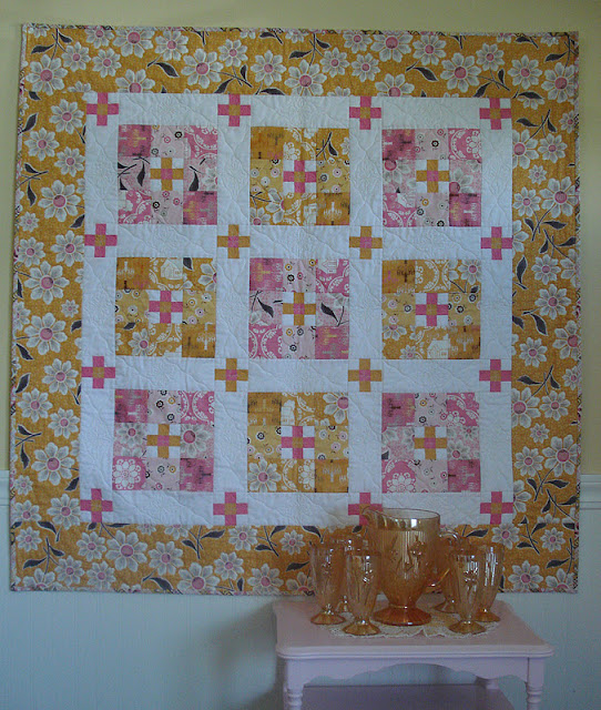 This quilt would really be cute on a table, that's for sure! My mother-in-law had a set of glassware/pitcher like that! Pretty!