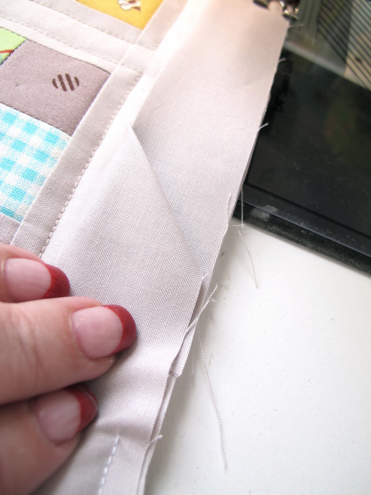 When I get to the corners I fold them over to the back and sew just to the machine stitching.
