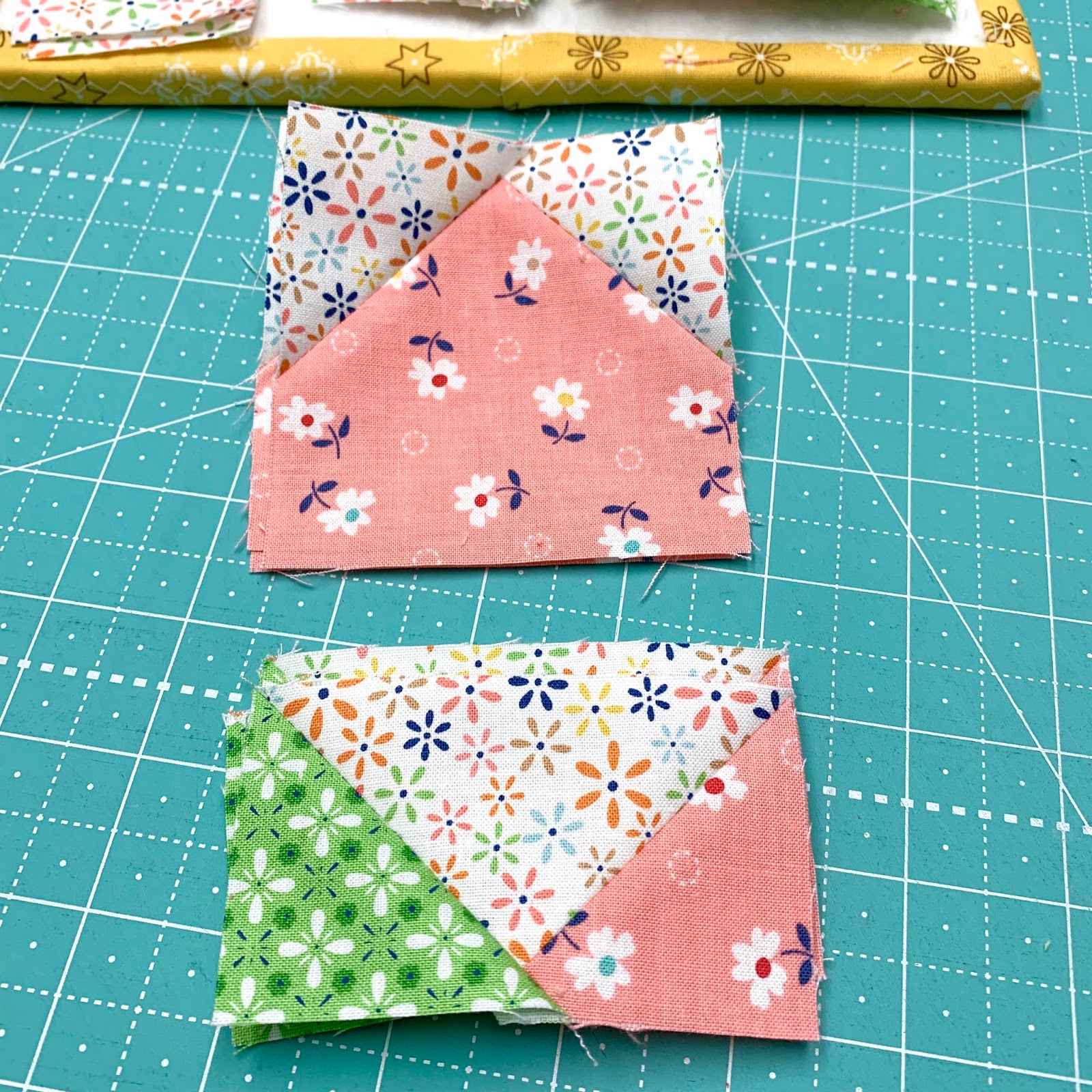 All you need to do when adding them is sew them diagonally across each corner of the block and trim.