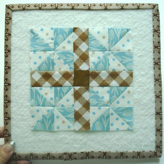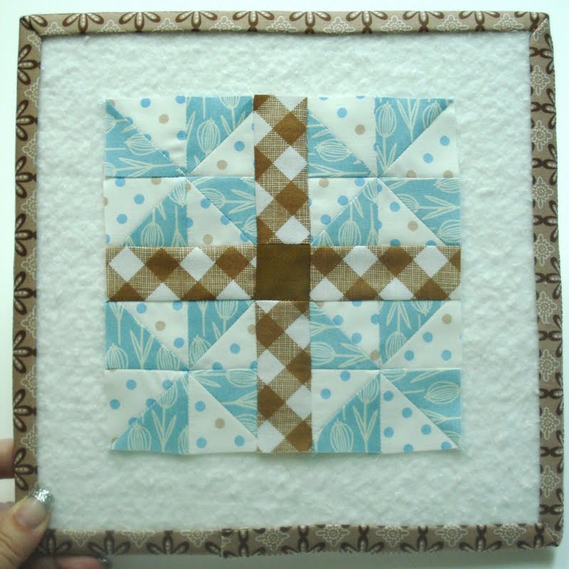and then cut 2 squares out of the background fabric "1/4" smaller" than the brown square.